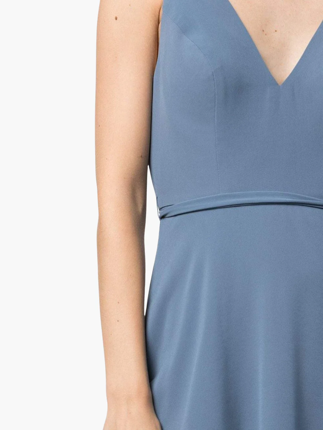 The Aprilia gown explores a hint of symmetry by mirroring the plunging neckline with the intersecting v-shaped back straps. Featuring a sleeveless plunging neckline, an a-line silhouette, and an elongated waist tie, this dress is subtly divine.