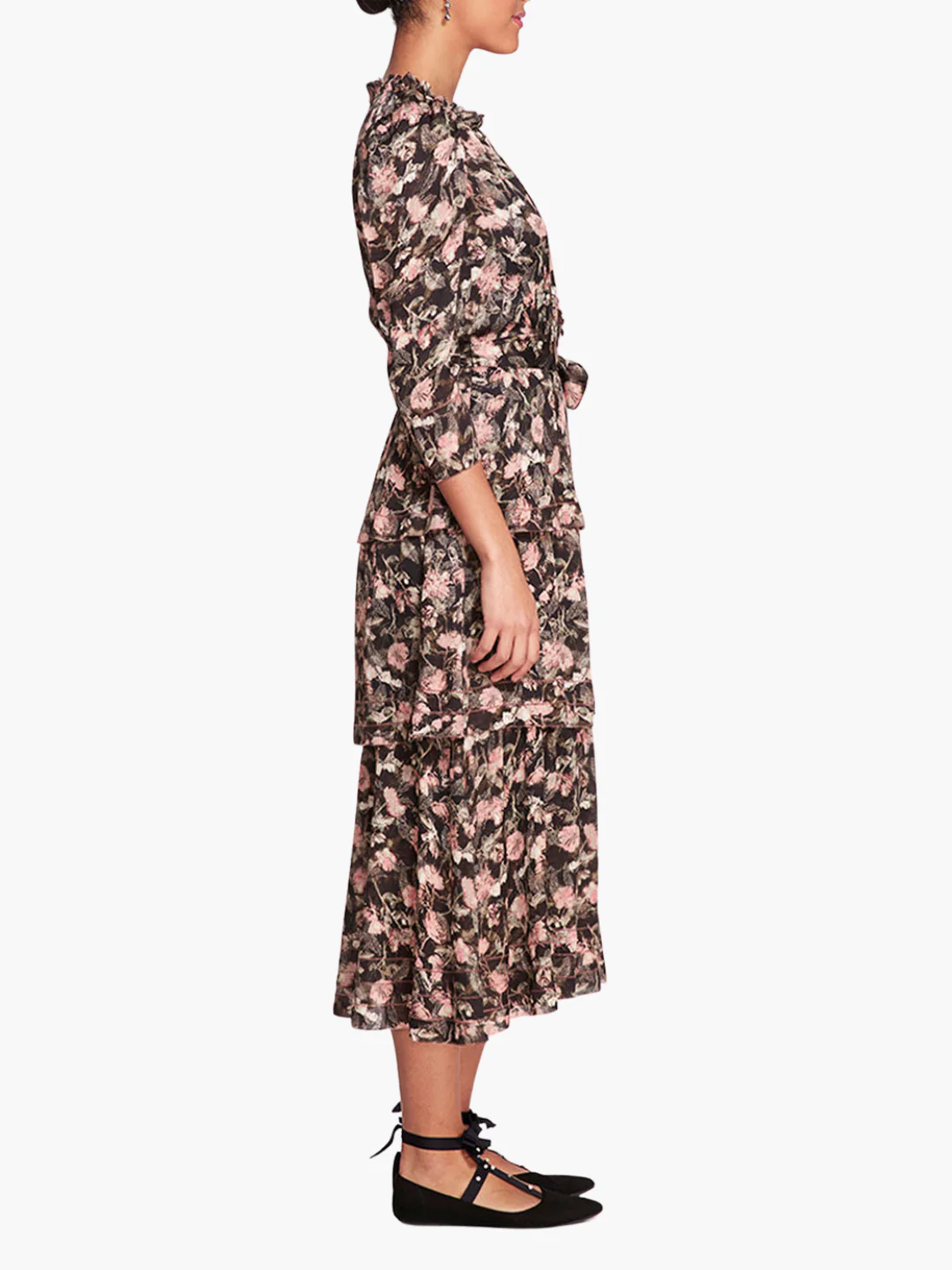 The Juniper midi dress features a muted garden printed on delicately draped viscose. The 3-tiered embroidered dress is complete with picot edging and a dainty bow at the neckline.