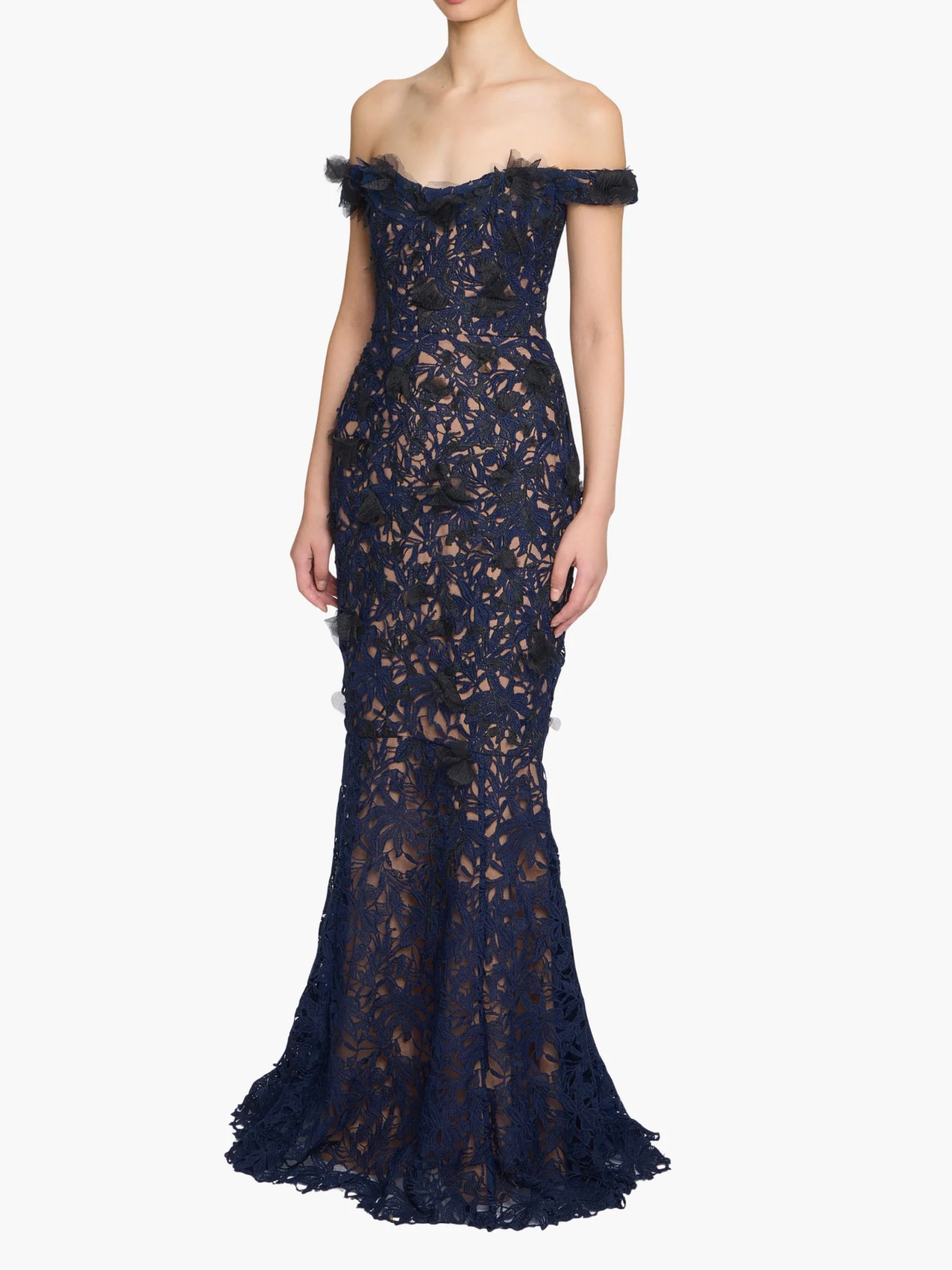 A vision of modern romance, this Guipure Lace Gown highlights a sculpted off-the-shoulder neckline and dimensional 3D petals that bloom across with intricate lacework. The design follows the body’s natural lines before unfolding into a gentle flare that allows for soft movement.