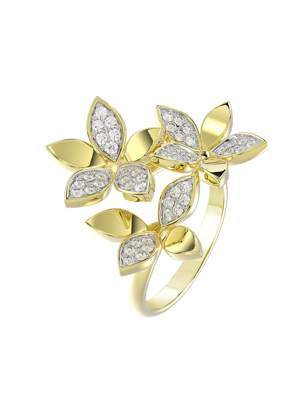 The Wild Flower Yellow Gold Ring features a yellow gold open band set with pavé diamonds and complete with a trio of dynamic teardrop-shaped diamond and yellow gold flowers.