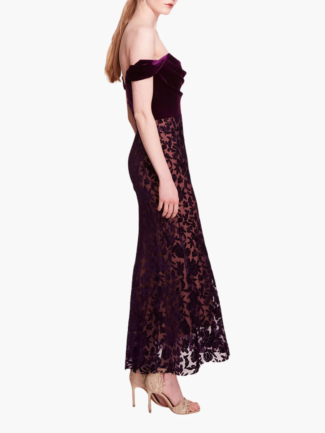 Elevate your evening style with the Velvet Cutwork Midi Dress, featuring a chic off-the-shoulder design and a flattering sweetheart neckline. The velvet cutouts add a touch of allure, while the solid velvet ruched bodice enhances your silhouette for a stunning effect.