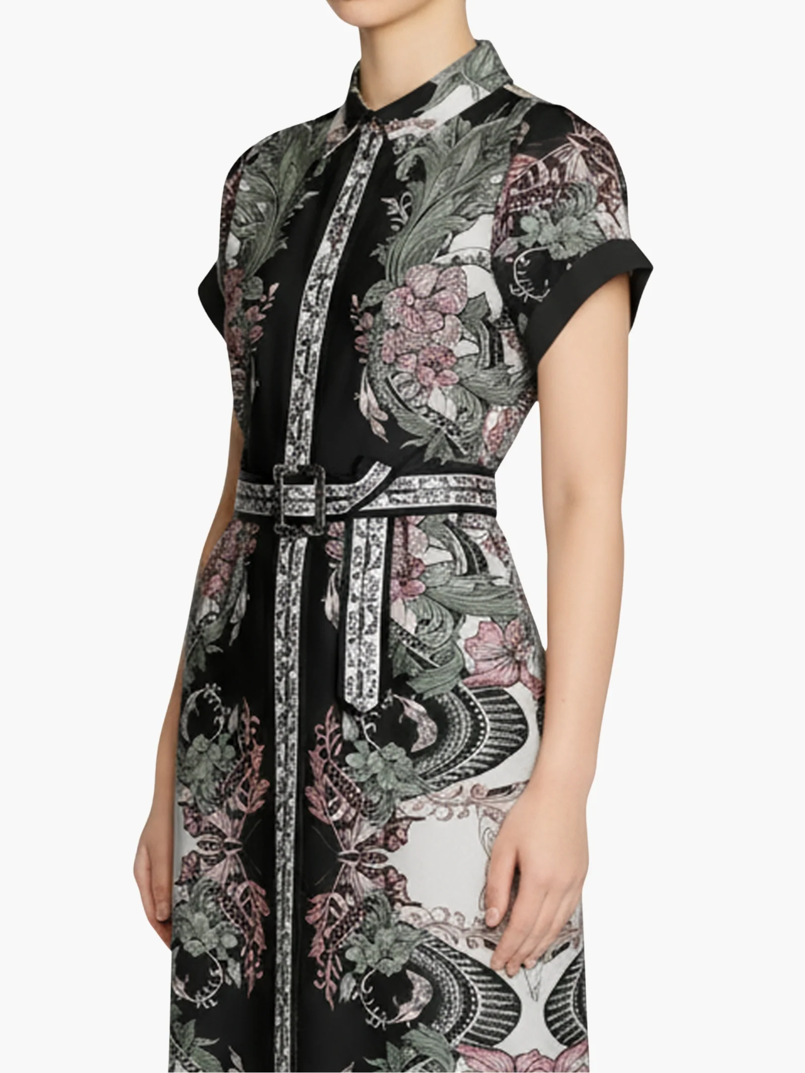 Crafted from viscose twill, the Belted Twill Shirt Dress features an a-line silhouette with covered buttons, contrasting chiffon corded piping, and a coordinating printed belt for a coordinated and refined finish.