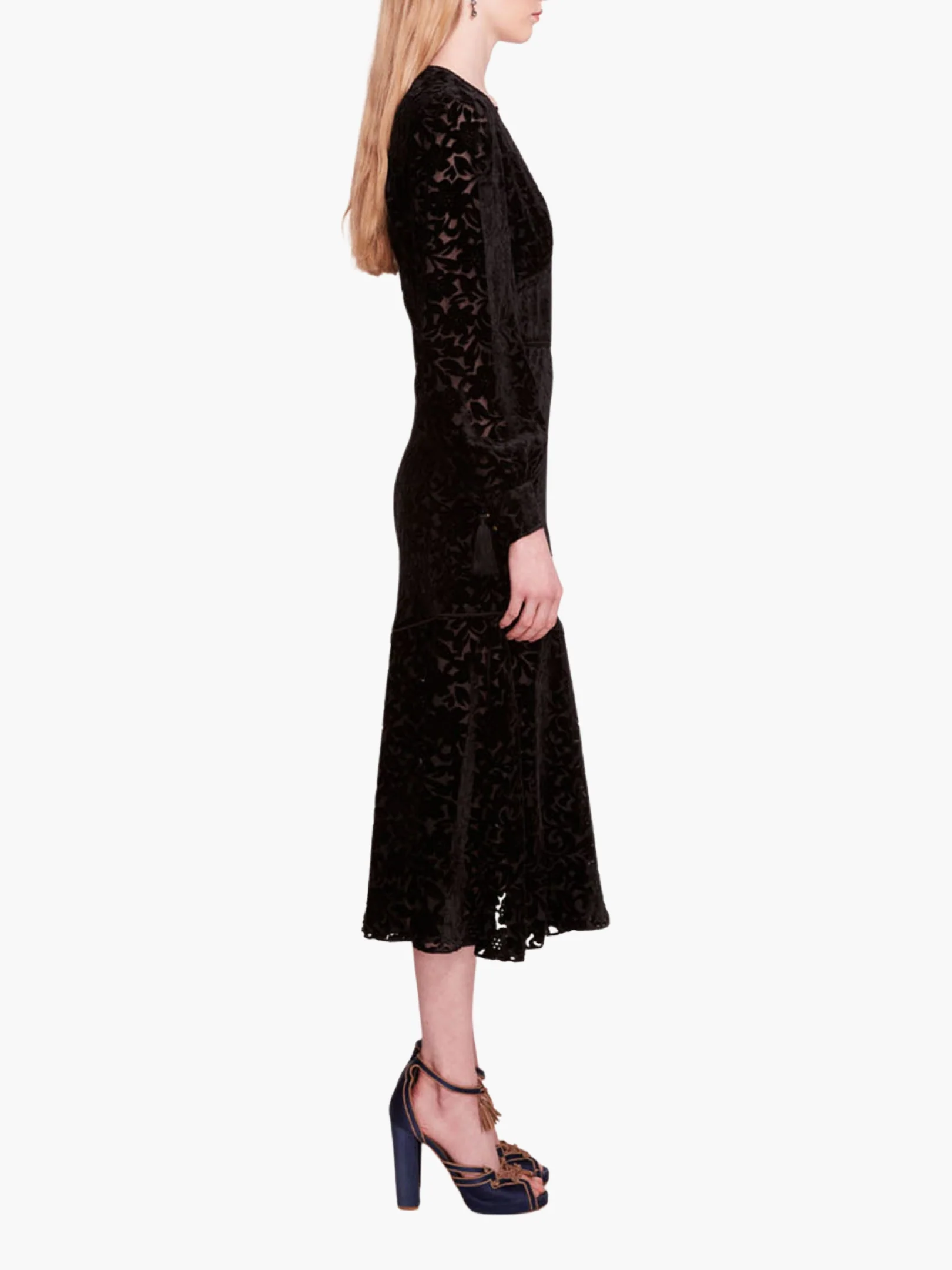 The Velvet Burnout Midi Dress features a v-neckline and long cuffed sleeves for a sophisticated look. The flared skirt adds movement and grace, while metal bobble buttons and cuff tassels provide unique detailing. A separate rope tassel belt completes the look.
